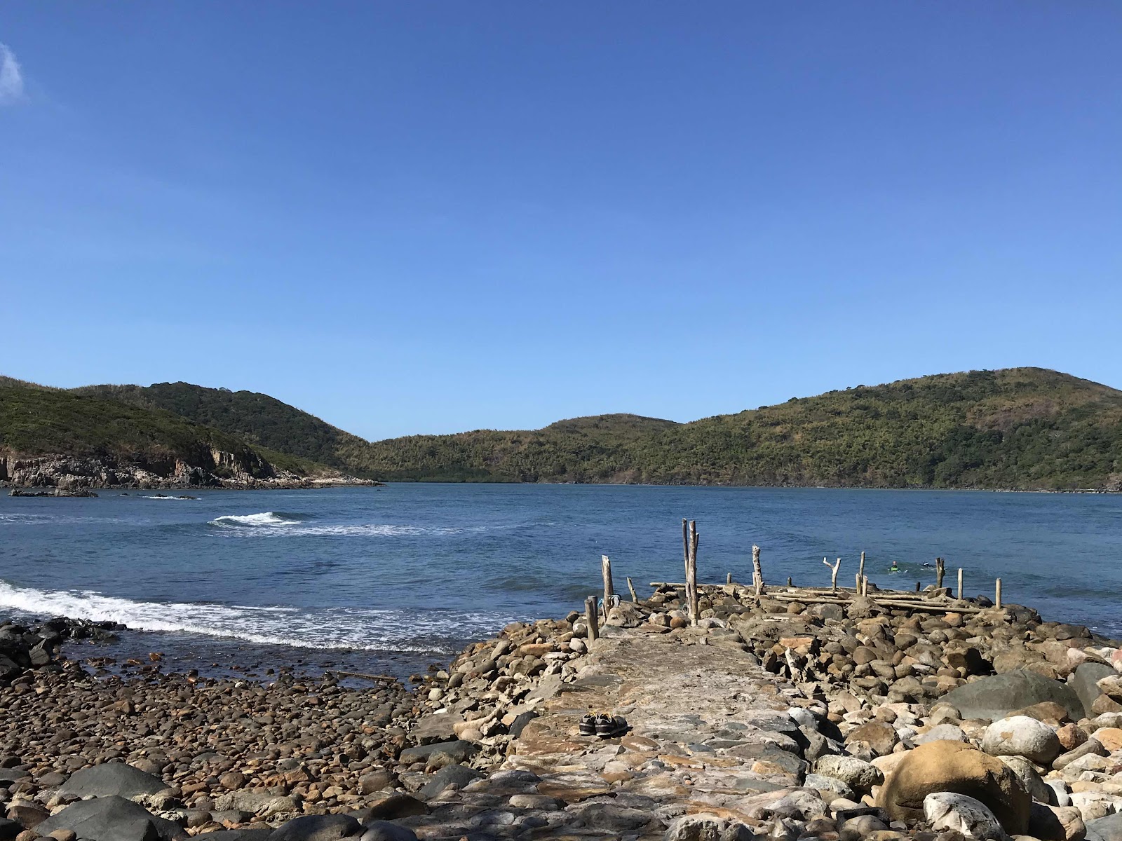 I was sweating to put it mildly and Amanda realised that I was probably getting dehydrated, I had been saving my water, but she assured me that she thought there would be drinks at the rangers station at the other end. This section, through the jungle was 3km, the longest 3km I have ever walked! Once up the steepest part it went up and down along the headland, we think, we couldn't see through the trees! .....and eventually started to go down hill. It took about an hour and a quarter to reach our destination and, yes, the ranger station had drinks! I bought a coco cola to replenish my electrolytes etc and we made out way down the stony beach. They call Dam Tre a lagoon, but in fact it is a long inlet and only becomes a lagoon at low tide as we saw from the plane as we left the island. The tide had turned when we got there and was coming in quite strongly. I had to use my walking poles to get to the waters edge, it was very slippery but I had a quick swim. Amanda and Orlo snorkelled several times drifting with the tide, Andrew also had a go, the first time snorkelling for him. They saw lots of coral, some parrot fish and giant clams. I has not taken my snorkel mask, I could have borrowed from them but the waves were a bit strong for me. We had another great crackers and cream cheese and fruit picnic along with left over pizza which had been boxed for us the night before. Then I laid out my towel Costa del sol style on the concrete path and had a snooze!